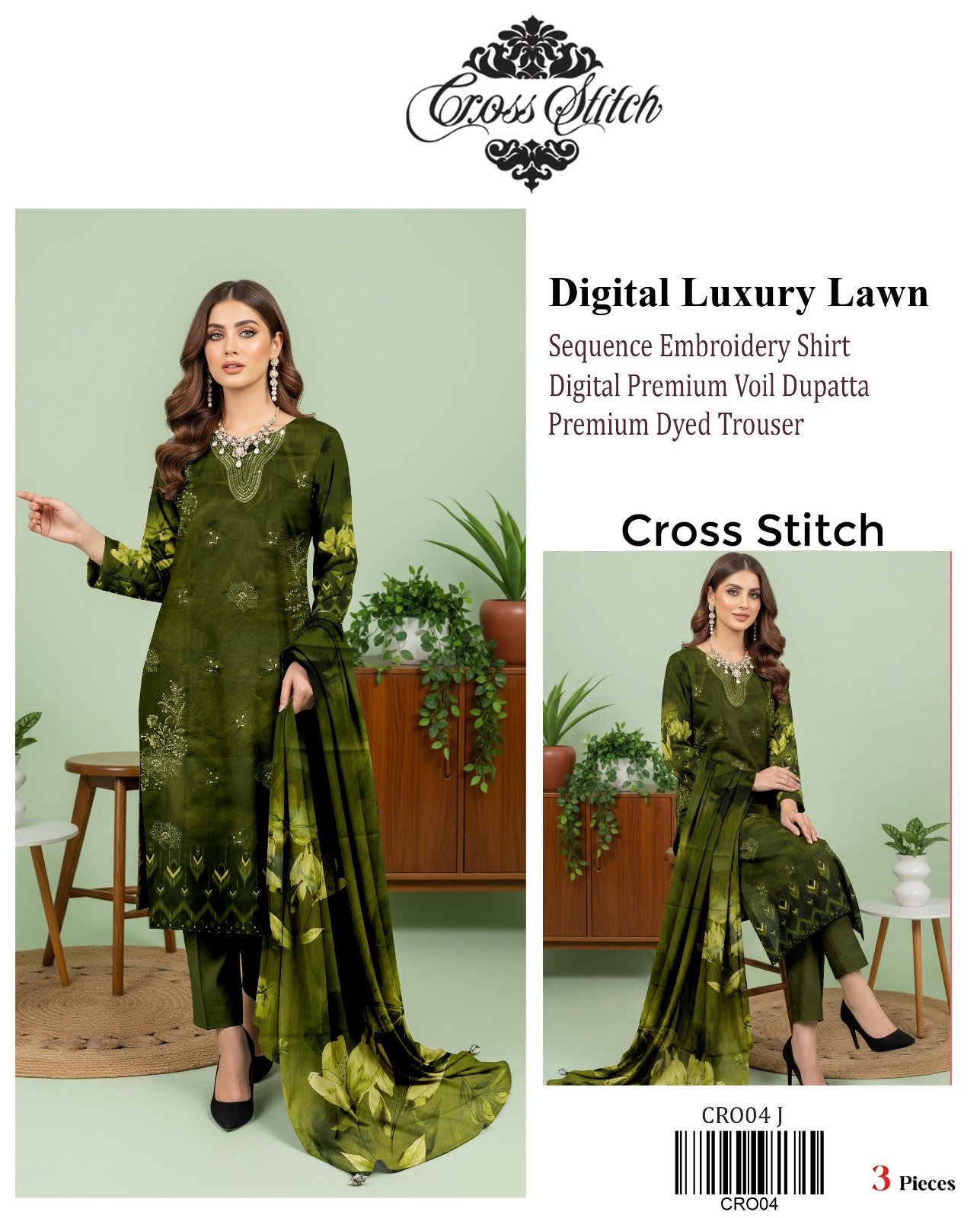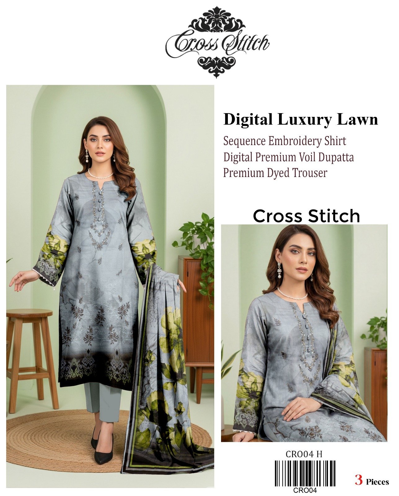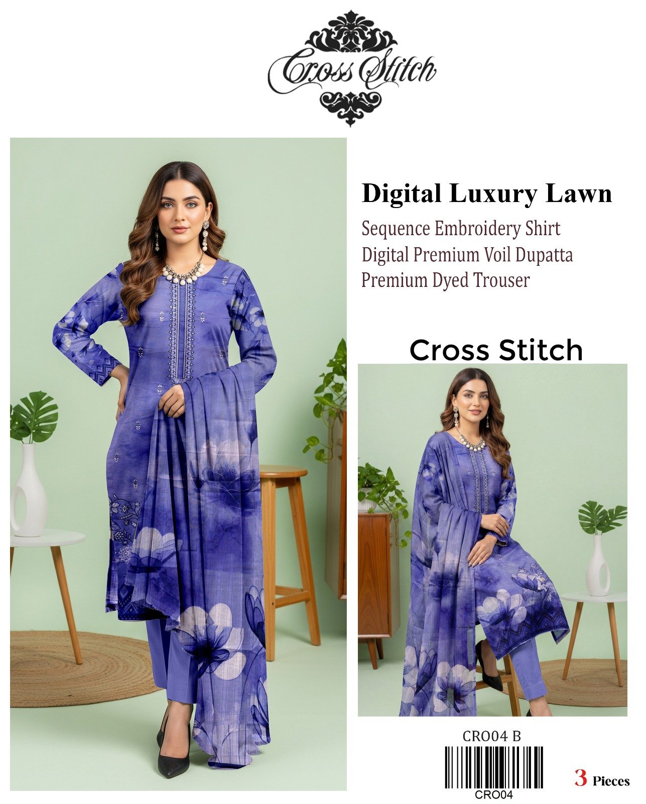 “CROSS STITCH” Digital Luxury Lawn With Seq Emb Shirt With Premium Voil Dupatta {Box 10 Suits}