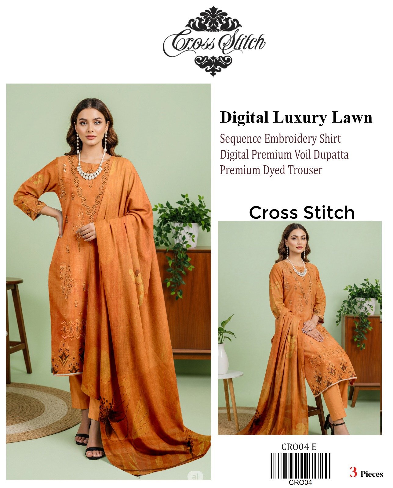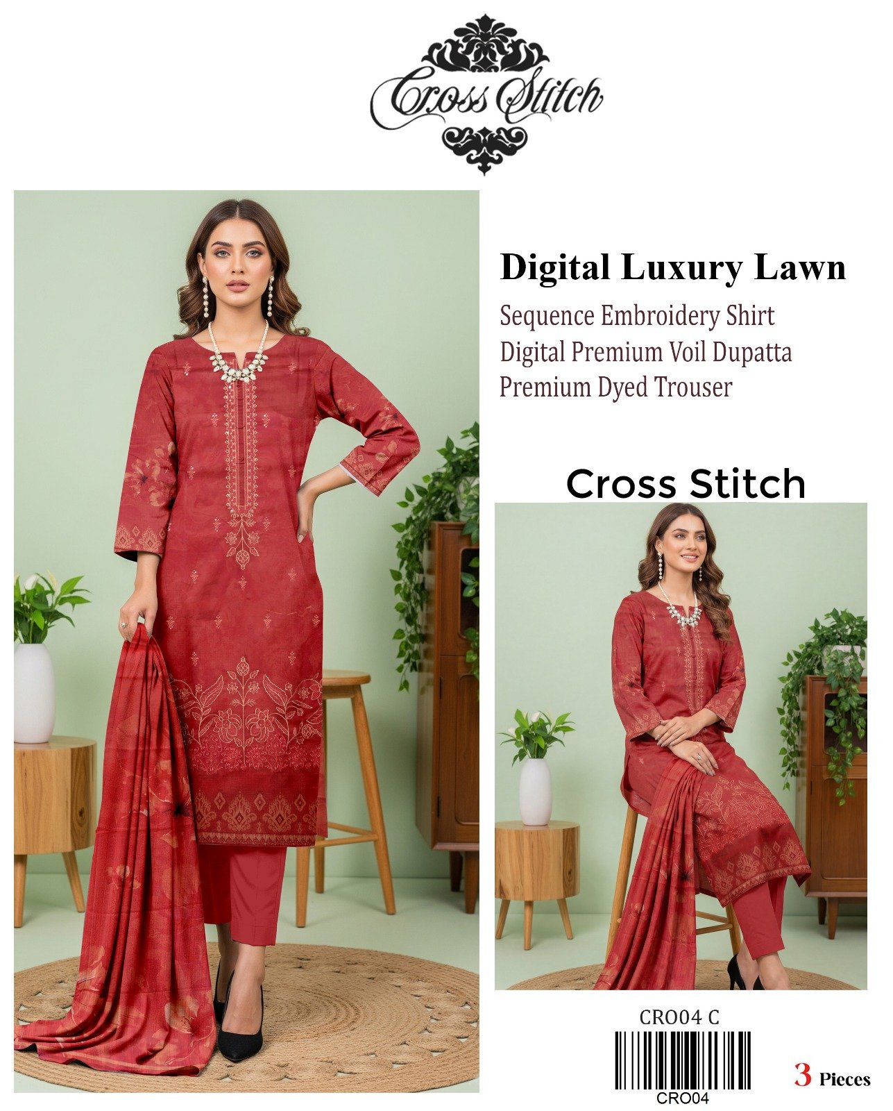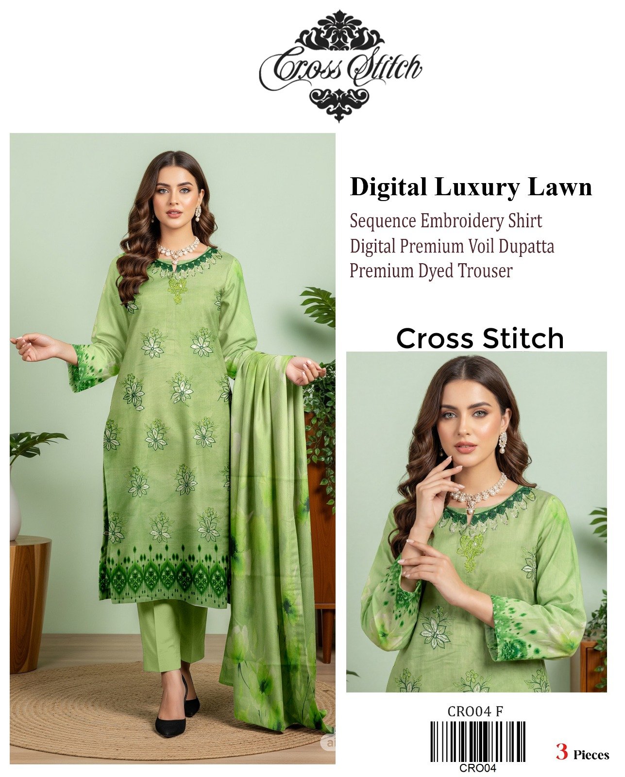 “CROSS STITCH” Digital Luxury Lawn With Seq Emb Shirt With Premium Voil Dupatta {Box 10 Suits}